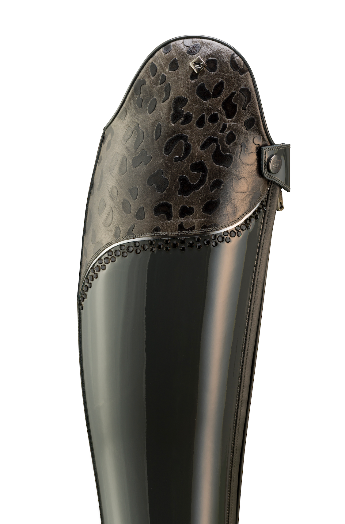 S5601 Dressage Top Cleopatra in Panterina Grigio Decoration GG05 in SS16 and SS20 Black Diamond Leg in Patent Grey Top piping and zip guard in Patent Grey Heel and Foot in Brushed Grey Details in Specchio Iron Price upon request 8-10 weeks or 5 weeks with a RUSH SHIP speak with Amanda 310 739 8605 amanda@geegeeequine.com not brushed $1,710