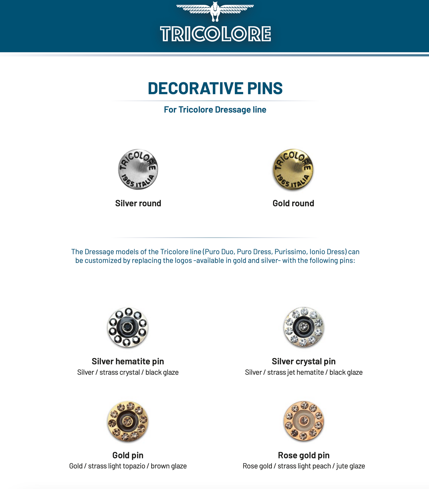 You can add these new logo buttons or piping to your Dressage Tricolore boot made by DeNiro Puro Duo, Ionio, Puro when your order a pair of Dressage boots.