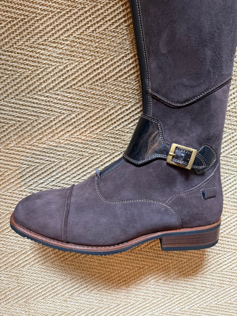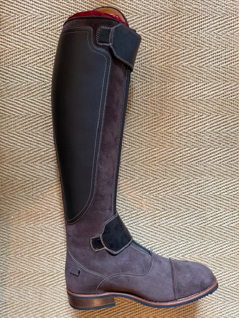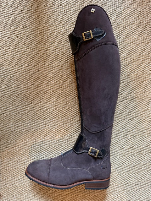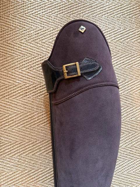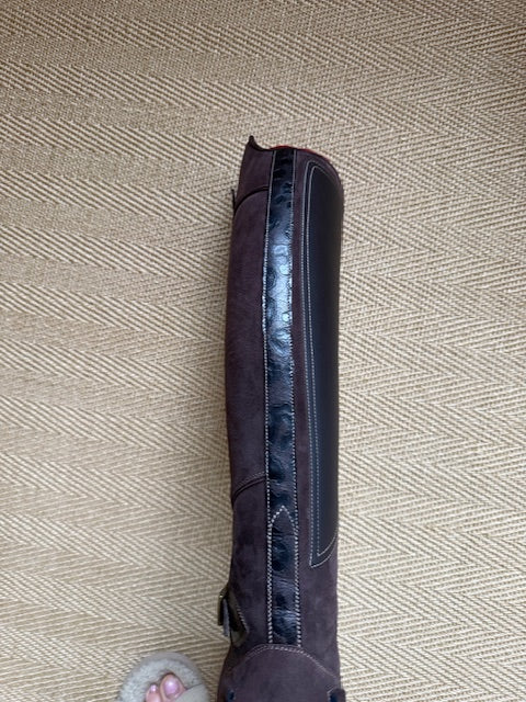 This was made for me, but I’m now looking for a Dressage boot with a hard outer shell. Want to sell quickly.Can be Dressage or regular boot. Brown Suede boot with Panterina buckle and brass accents. This boot is soft and has the panterina swatch going up the back stripe in panterina. Embrace elegance with these brown suede boots, adorned with Panterina swatch/ buckle and brass accents. Their softness invites you to step into comfort, while the Panterina swatch gracefully ascends the back stripe, making each stride a statement of style. You can see choices of colors in suede the boot pictured is the dark