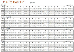 Please call or email me If you need a boot in a specific size. It takes 8 weeks to arrive from Italy, prices do vary depending on what you need . DeNiro Boot Company is famous for quality, style, and innovation in the Equestrian World. It is the time spent on research and attention to detail that has allowed DeNiro Boot Co. to become one of the industries market leaders in boot production. All the DeNiro Boots are handcrafted in their own factory, in Lecce, in the heel of Italy. All the boots subjected to rigorous testing and quality control, with the aim being complete customer satisfaction!