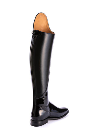 The beautiful Volta SL model is a dressage model by the brand De Niro Boot Co. The boots are handmade in Italy, by specialised craftsmen with years of experience. What’s particularly special about the Volta SL model boots is that they are a dressage model, but with a zipper at the back. Other De Niro Boot dressage models often have the zipper diagonally in the front of the boot. The zipper at the back makes it easier to put the boots on and take the boots off. This back zipper position also offers better durability, since the leather around the ankle will not fold, stretch, or damage as much as it may with stepping into a boot with the diagonal zipper in other dressage models like the Raffaello and Bellini model. Additionally, the zip cages are less likely to break since they are in a less vulnerable spot. The De Niro Volta SL boot features a beautiful high dressage arch of 10cm for calf sizes S and smaller. From calf size M and up, the dressage bow will be 8cm tall, which is the standard high dressage bow for other De Niro dressage models. Like any other De Niro model, the De Niro Volta SL dressage boots can be completely customized to meet your every wish.