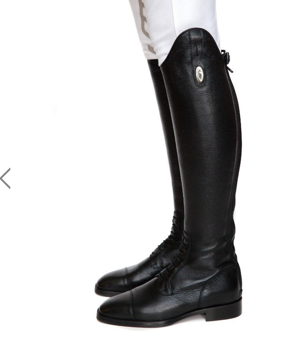 Pebble leather new design. The basic Amabile boot has been upgraded with a new inlaid patch lower zip guard including the rear spur guard. This will last longer with the inner patch, break-in is minimal as the boot comes in soft pebble leather or smooth leather for showing. A 4-week delivery estimate; we have this boot available at the store in smooth leather. Dress boot takes 8 weeks