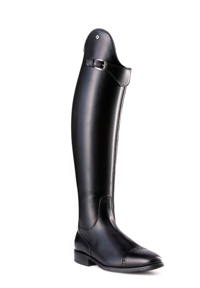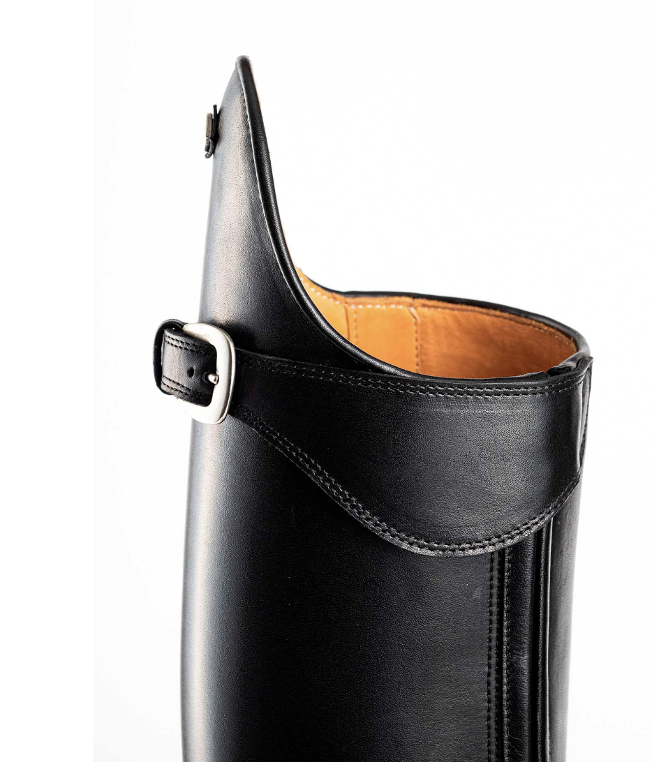 JB02 dressage boot crafted from Calfskin WRAT leather Full natural calfskin leather lining Big strap with buckle Toe cap with punched holes Styled ankle YKK® 9 mm front inside zipper Comfy outer leg reinforcement Back Stripe with fishbone Medium cut counterfort Removable insole with activated carbon absorbs shock