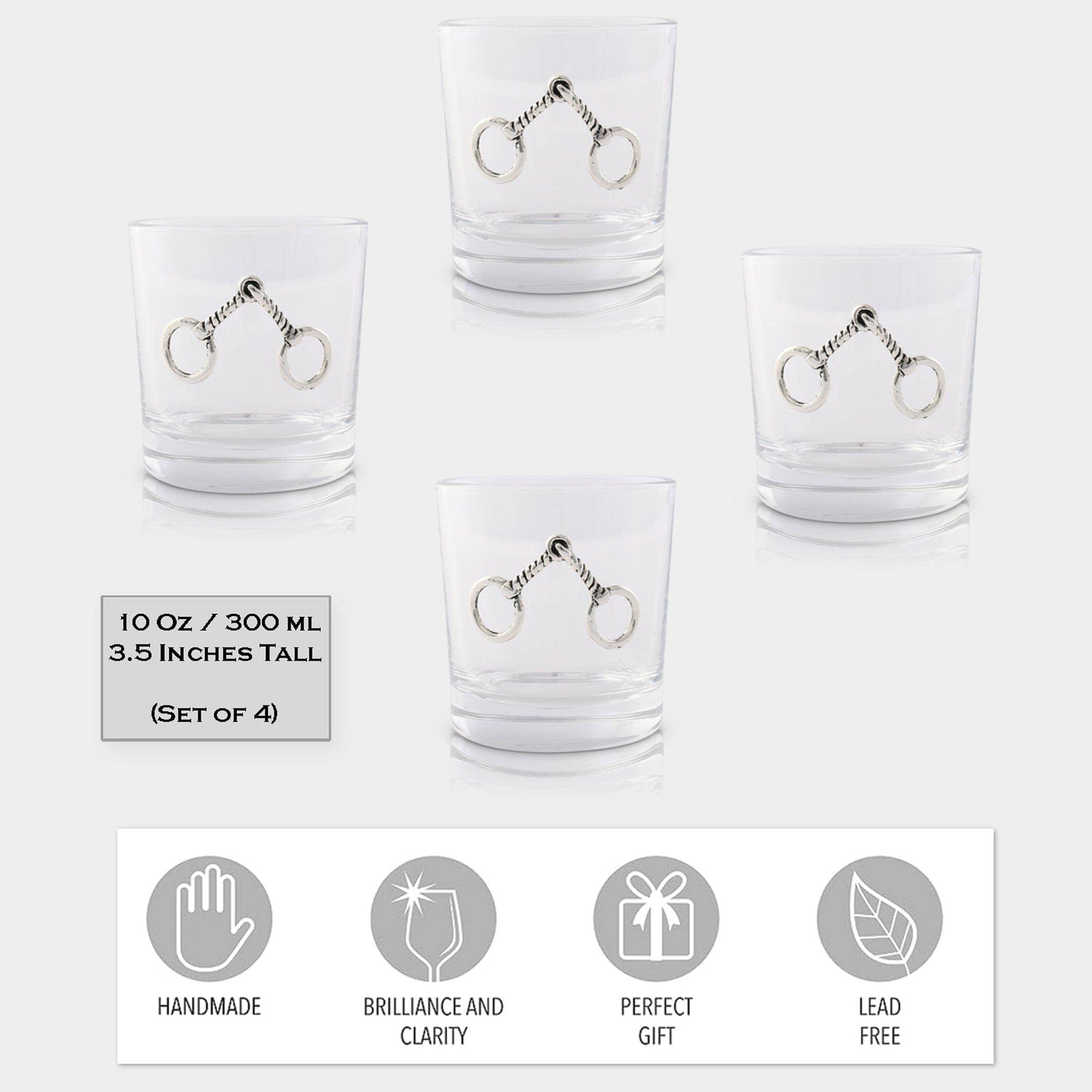Introducing the Equestrian Bit Bar Glasses Set of 4, the perfect addition to any equestrian enthusiast's home bar collection! Each glass in this set features a unique equestrian bit design etched onto the surface, adding a touch of elegance and sophistication to your drinking experience. Crafted from high-quality glass, these glasses are durable and easy to clean, making them ideal for everyday use or special occasions. The glasses have a comfortable weight and a sleek, smooth texture that feels great in your hand.