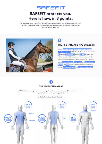 SAFEFIT has the same certification as Horse Pilot, ALLSHOT, Free Jump, Peneloppe, Equitheme and the latest Hit-Air which is NF72-800:2022